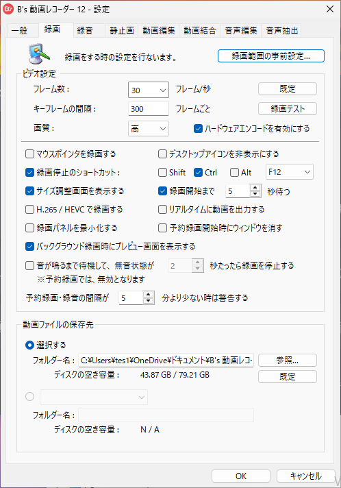 H.265/HEVC で録画する : ON にすると同等の画質でファイルサイズを約半分にできます。ただし録画、再生時にパソコンへ多くの負荷がかかるためお使いの環境によって正しく録画、再生できない場合があります。その場合はこのチェックをOFFにしてください。デフォルトはOFFです。