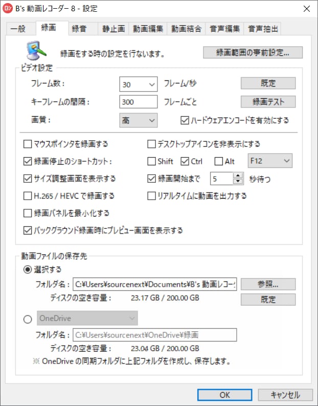 H.265/HEVC で録画する : ON にすると同等の画質でファイルサイズを約半分にできます。ただし録画、再生時にパソコンへ多くの負荷がかかるためお使いの環境によって正しく録画、再生できない場合があります。その場合はこのチェックをOFFにしてください。デフォルトはOFFです。