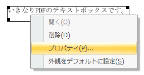 ※赤枠を消したり、色を変更したい場合は、赤枠内をクリックし、枠部分が黒く選択された状態(四隅が黒の正方形になっている状態)で右クリックし、「プロパティ」を選択するとテキストボックスのプロパティ画面が表示されるので、設定して「閉じる」をクリックします。
