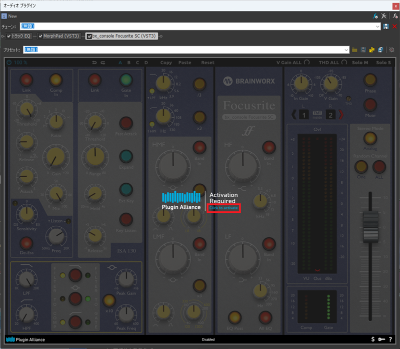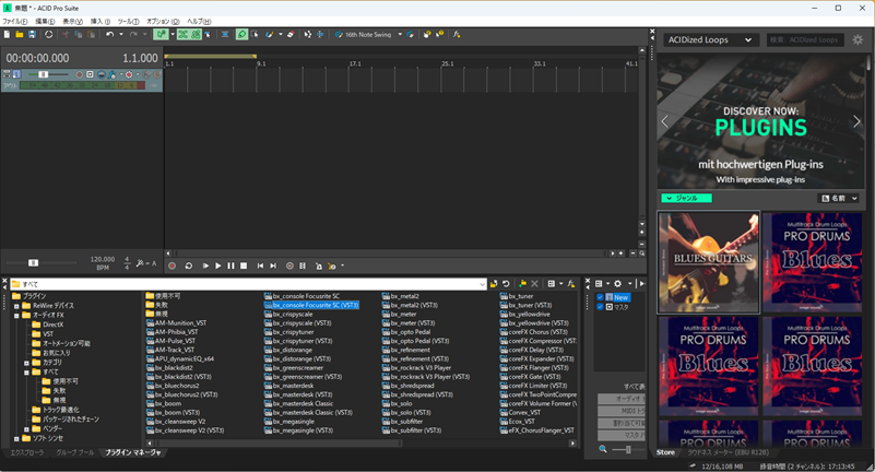 25.Acid Proを起動し、任意の音楽ファイルを読み込み後[プラグインマネージャー]>[オーディオFX]>[すべて]から[bx_console Focusrite SC]をトラックに移動させます。