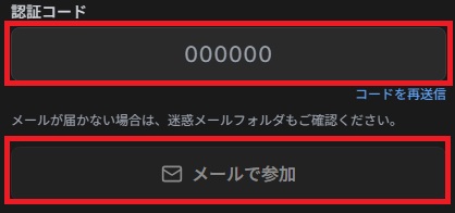・入力したアドレス宛に認証コードが記載されたメールが届くので、そのコードを入力して [メールで参加] をクリックします。
