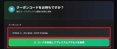 お持ちの クーポンコードを入力すると、 [コードを利用してプレミアムアクセスを取得] ボタンが表示されますのでクリックします。