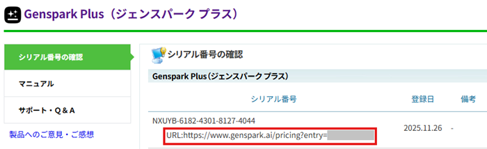 https://www.genspark.ai/pricing?entry=からはじまるものです。また、お客様専用ページでも「シリアル番号の確認」から確認できます。
