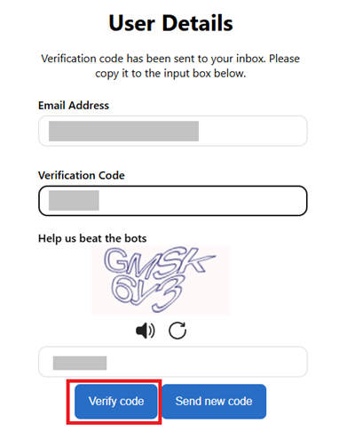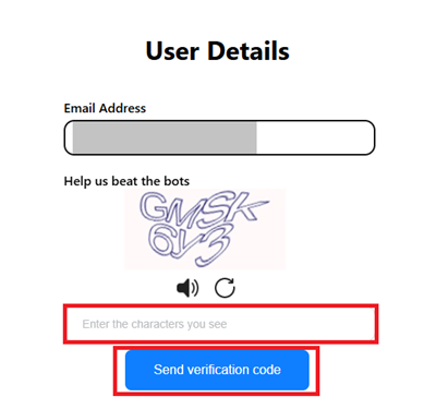 4.[Email Address]にEメールアドレスを入力し、[Help us beat the bots]に表示されている文字を入力後、[Send verification code]をクリックします。