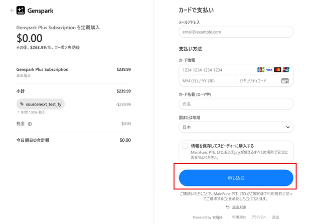 9.定期購入が$0.00になっていることを確認し、クレジットカード情報を入力後、[申し込む]をクリックします。