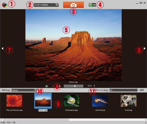 ①[ファイルメニュー]ボタン 選択した画像に対しての各種処理や設定を変更することができます。 詳しい操作方法については「その他の便利な機能」、または「いろいろなキャプチャの設定」をご確認ください。 ②[キャプチャ方法選択]ボタン デスクトップ、アクティブウインドウ、選択ウインドウ、矩形領域、楕円領域、フリーハンド、前回と同じ領域の中からキャプチャ方法を選択します。 詳しい操作方法については「キャプチャする」をご確認ください。 ③[キャプチャ]ボタン 選択した「キャプチャ方法」でキャプチャします。 ④[タイマー] ボタン タイマーの有効、無効を切り替えることができます。 詳しい操作方法については「いろいろなキャプチャの設定」をご確認ください。 ⑤[プレビュー]エリア キャプチャ、もしくは選択した画像を表示します。 画像をダブルクリックすると、現在の画面サイズに合わせる、等倍表示が切り替わります。 ⑥[次へ]ボタン 保存先にある次の画像を表示します。 ⑦[戻る]ボタン 保存先にある前の画像を表示します。 ⑧[拡大/縮小]ボタン ボタンでプレビューエリアの画像を拡大、縮小表示できます。 ボタンで現在の画面サイズに合わせて表示、ボタンで等倍表示の切り替えができます。 スライダーや値を直接入力すると、倍率をより細かく調整できます。 ※100%以上の倍率での表示はできません。 ※プレビュー画面のサイズよりも小さい倍率での表示はできません。 ⑨[サムネール]エリア 保存先の画像一覧を表示します。 また、キャプチャした画像はこの場所に保存されます。 ⑩[保存先]ボタン キャプチャした画像の保存先を変更できます。 標準はドキュメントのピクチャフォルダが指定されています。 ⑪[保存ファイル名] キャプチャ時のファイル名のルールを変更できます。 標準はSN + 連続する番号 となっており、任意の命名ルールに変更できます。