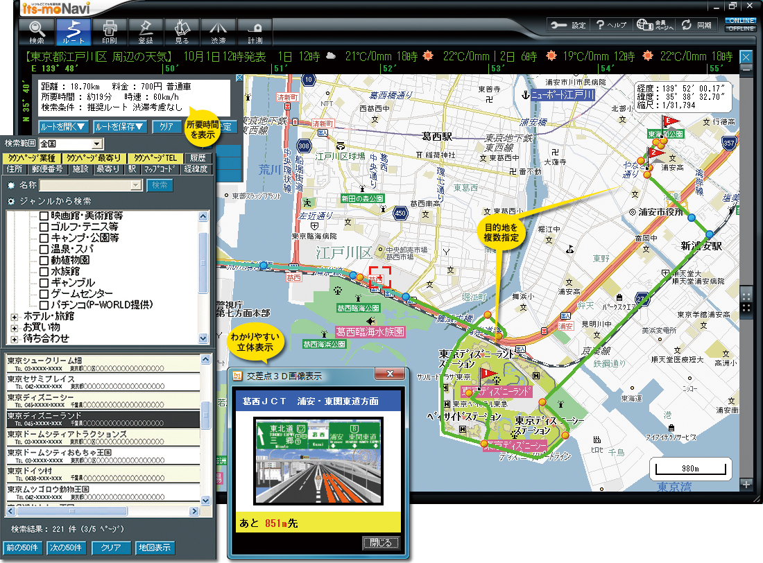 多彩な検索機能で、目的に合わせた探し方ができます。目的地を複数指定して、ルートを一発で検索することもできます。