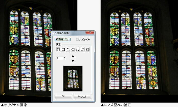 建築物の写真で気になるレンズによる歪みを補正できます。