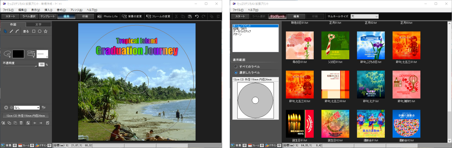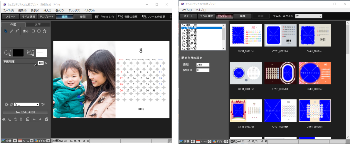 写真シールやカレンダー、ディスクラベル作成用にテンプレートを用意しています。