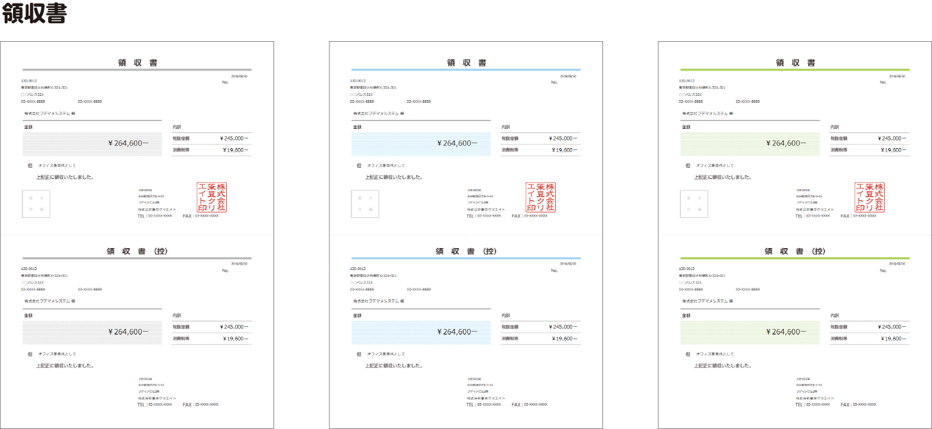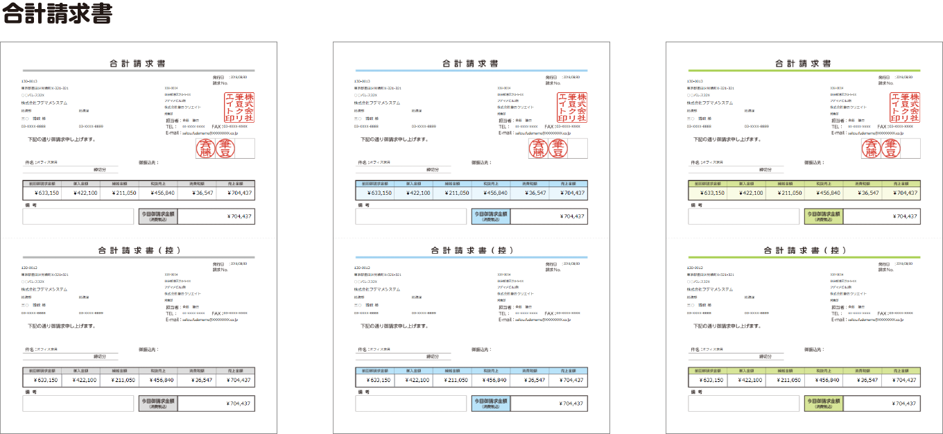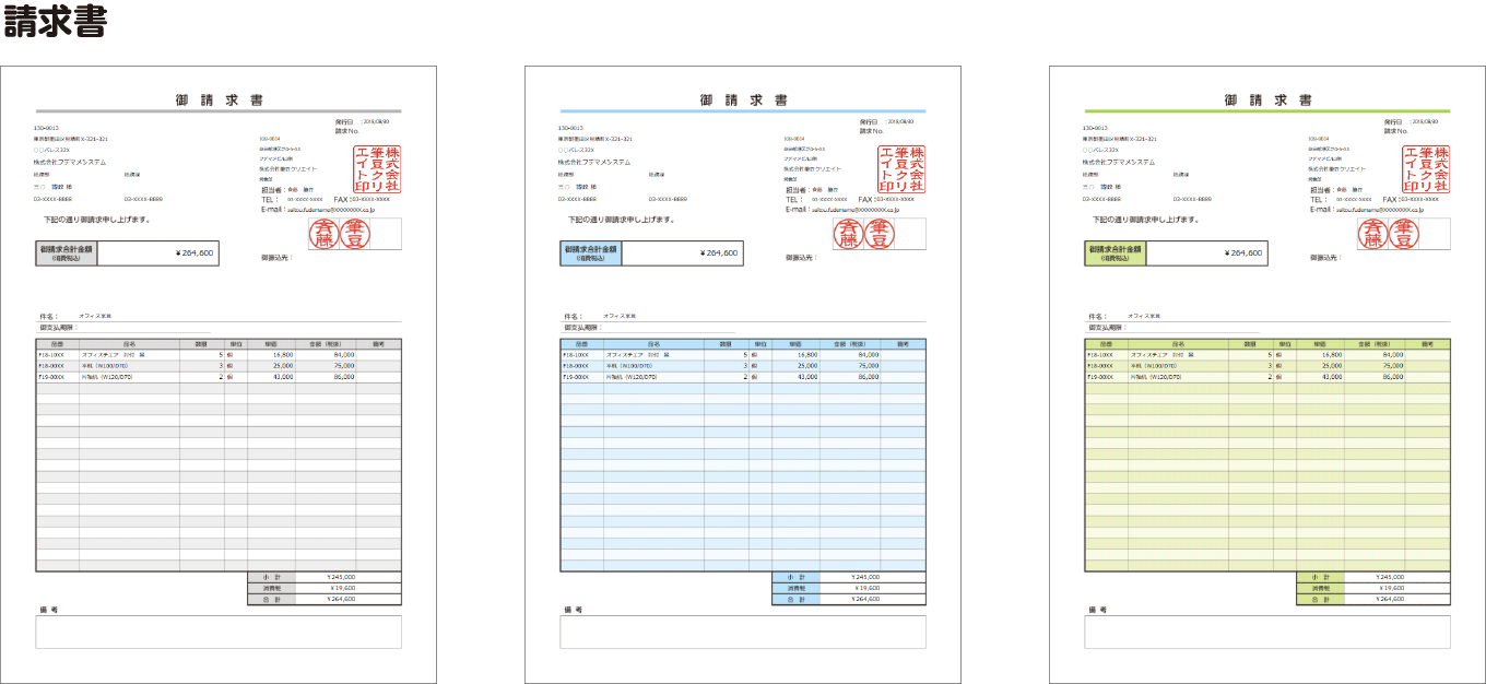 落ちついた雰囲気のシンプルな帳票が作成できます。カラーは3種類(ブルー・グリーン・モノクロ)からお選びいただけます。