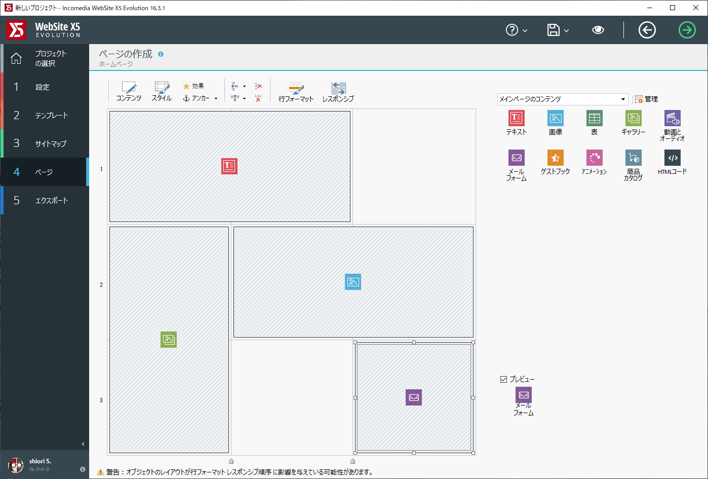 ページのレイアウトはマウスのみで簡単に変更できます。