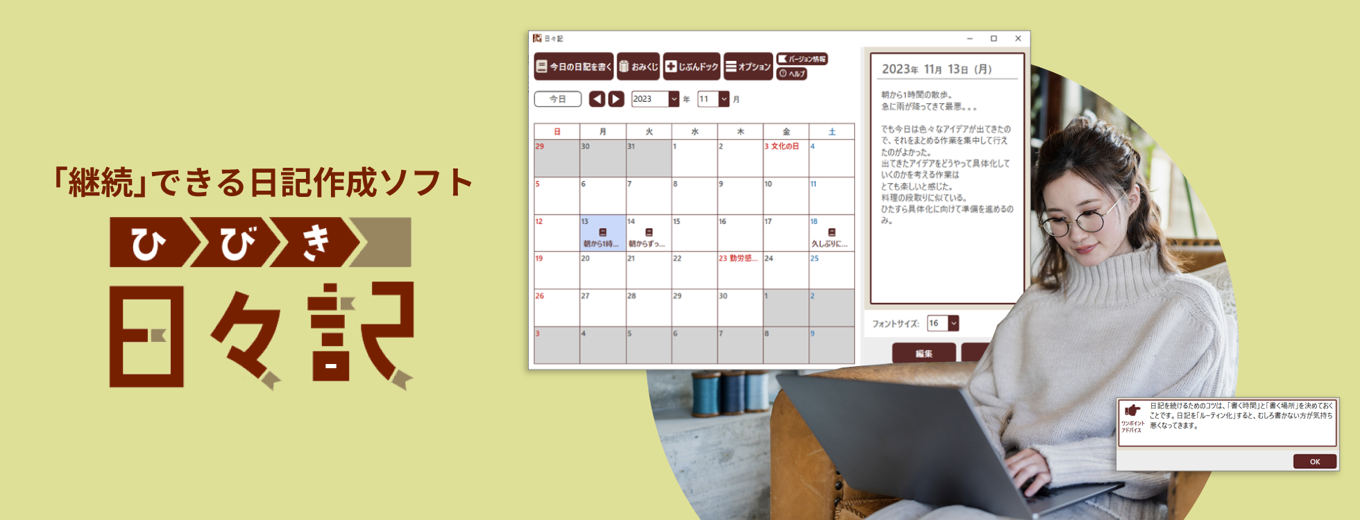 「毎日書き続けるのはちょっと・・・」と悩んでいる方は、とにかくソフトを起動してみましょう。このワンポイントアドバイスがきっかけになって、日記を書き続けられるはずです。