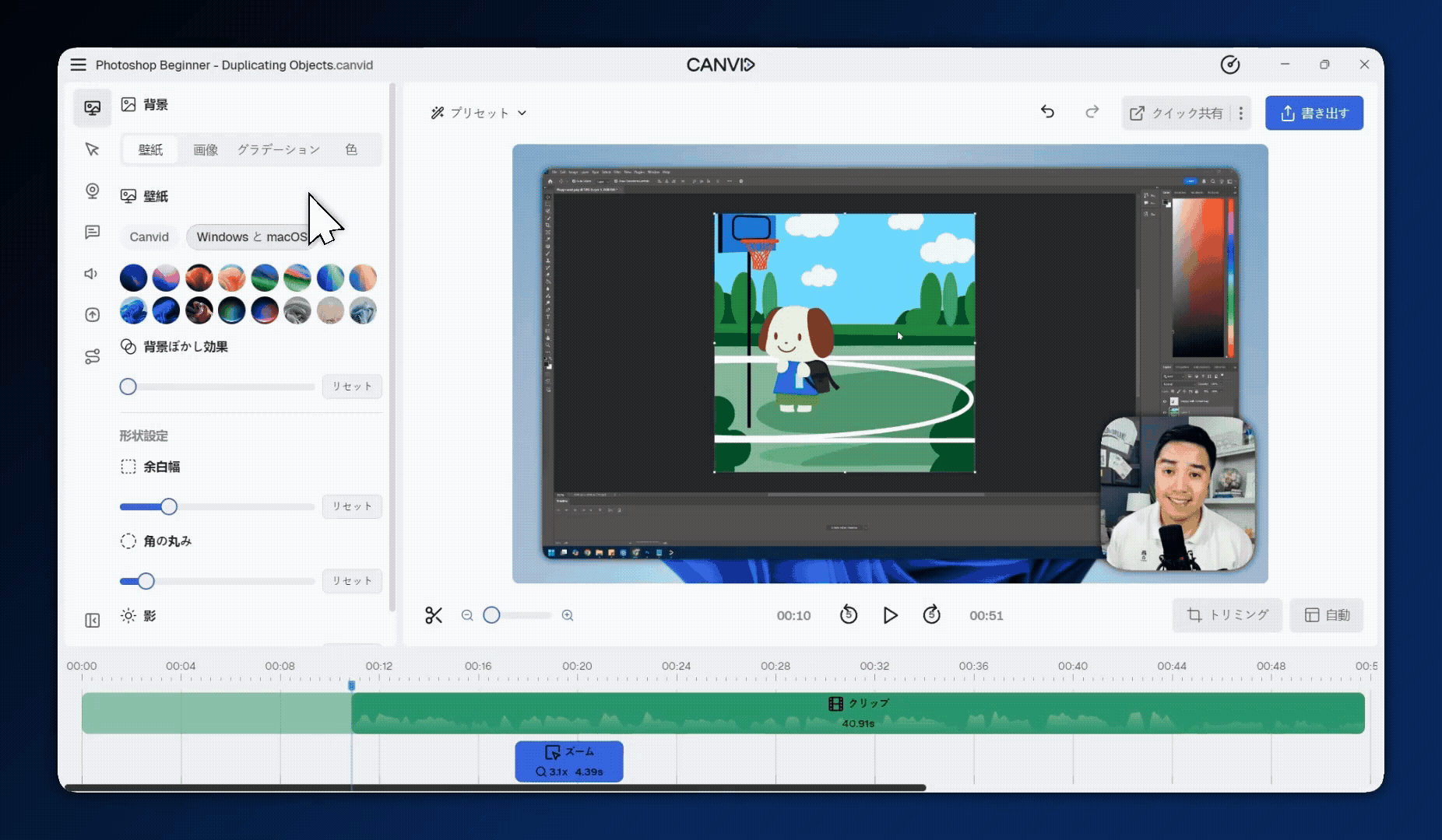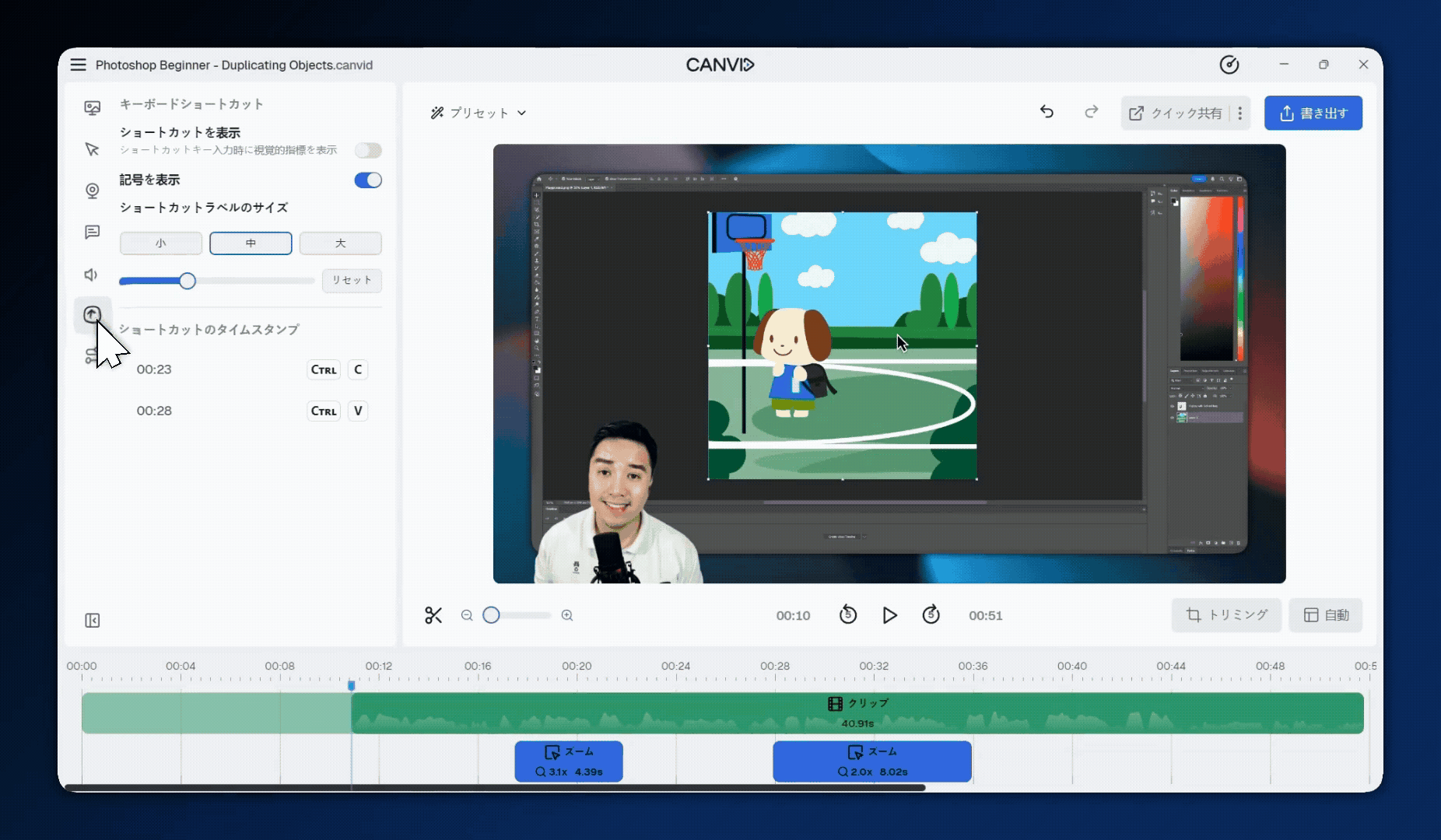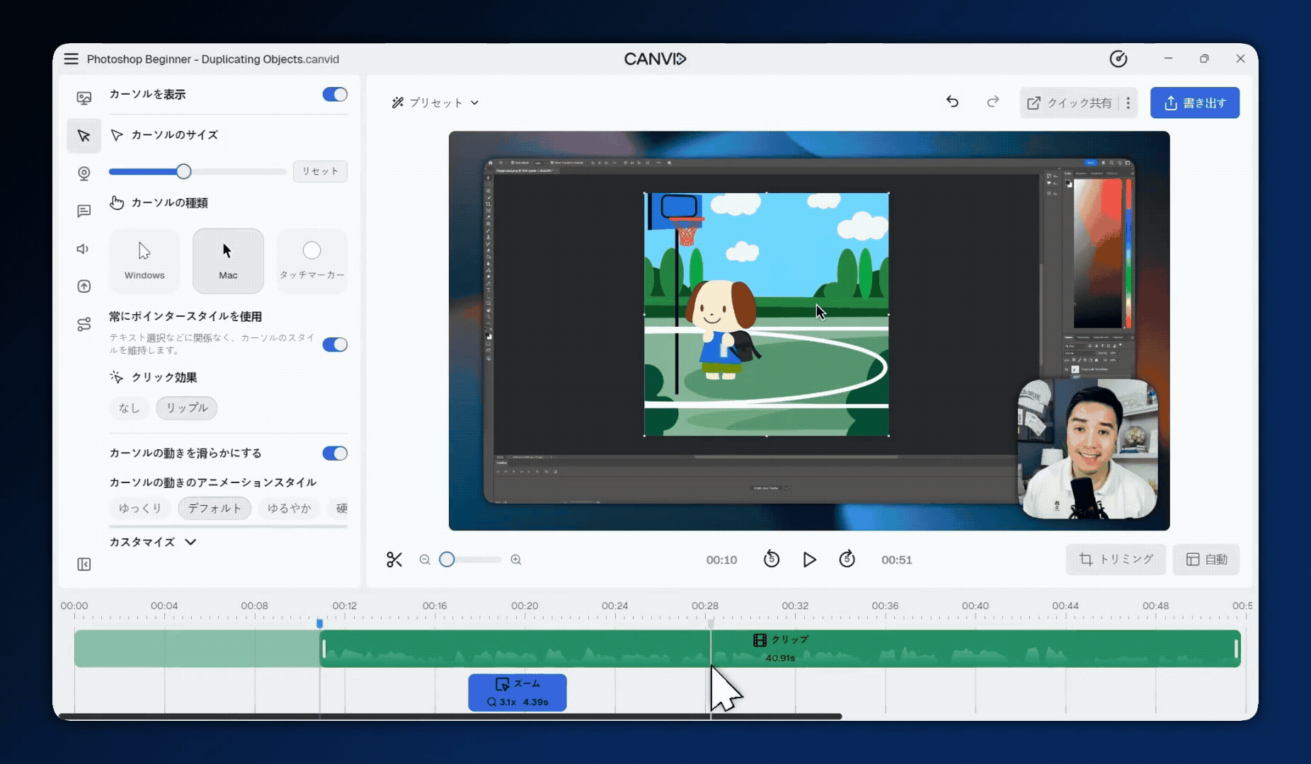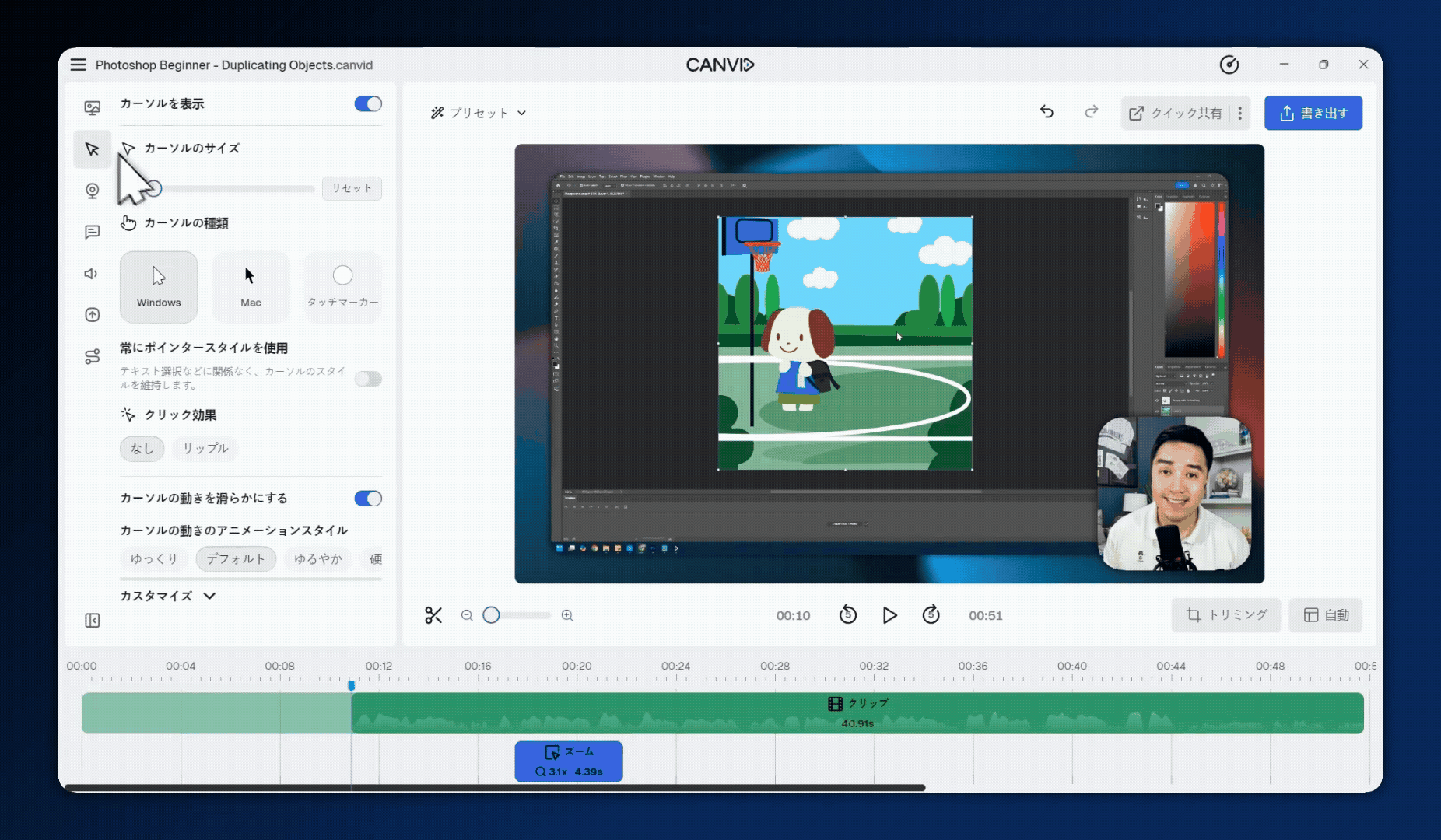 録画したPC画面の一部にズームインし、見せたい部分を大きく表示できます。