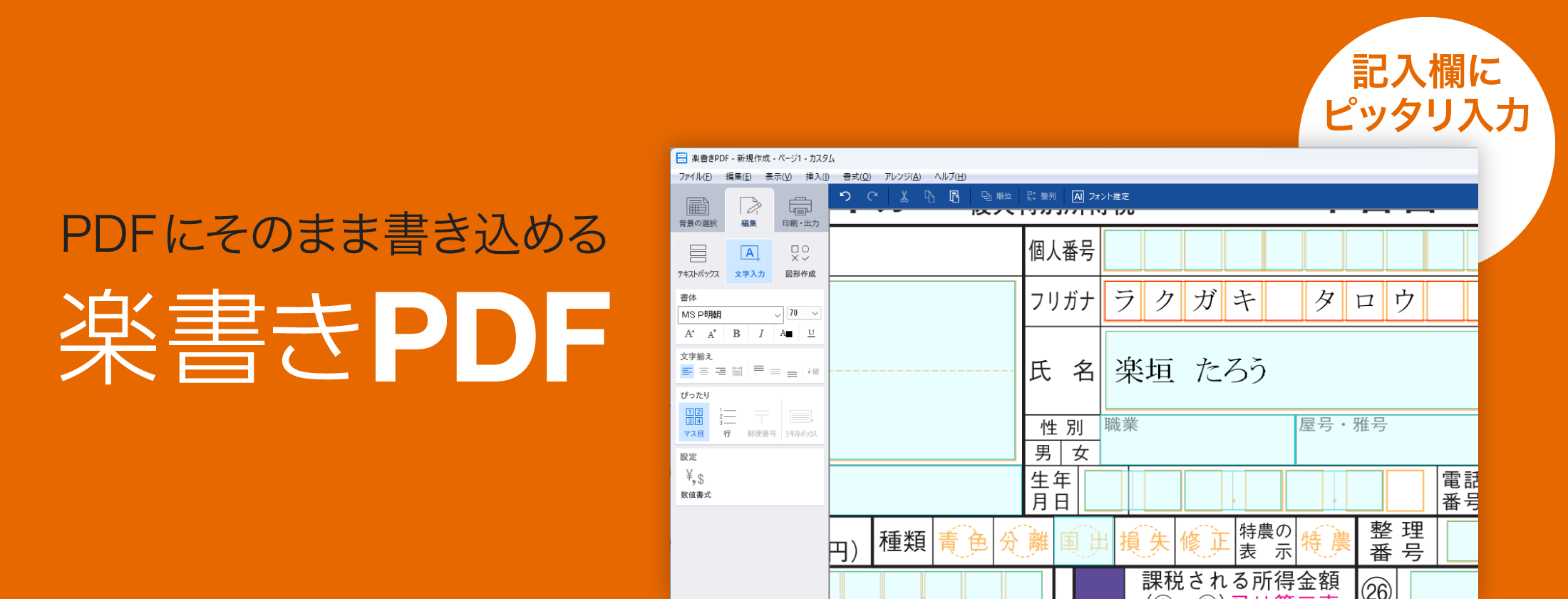 「楽書きPDF」は、PDFの画像に、直接文字を入力できるソフトです。スキャンした書類やPDFファイルの入力欄を自動で認識し、クリックするだけでピッタリ入力できます。プリントアウトして手書きする手間がなくなり、申請書や注文書などの書類作成が驚くほどラクになります。