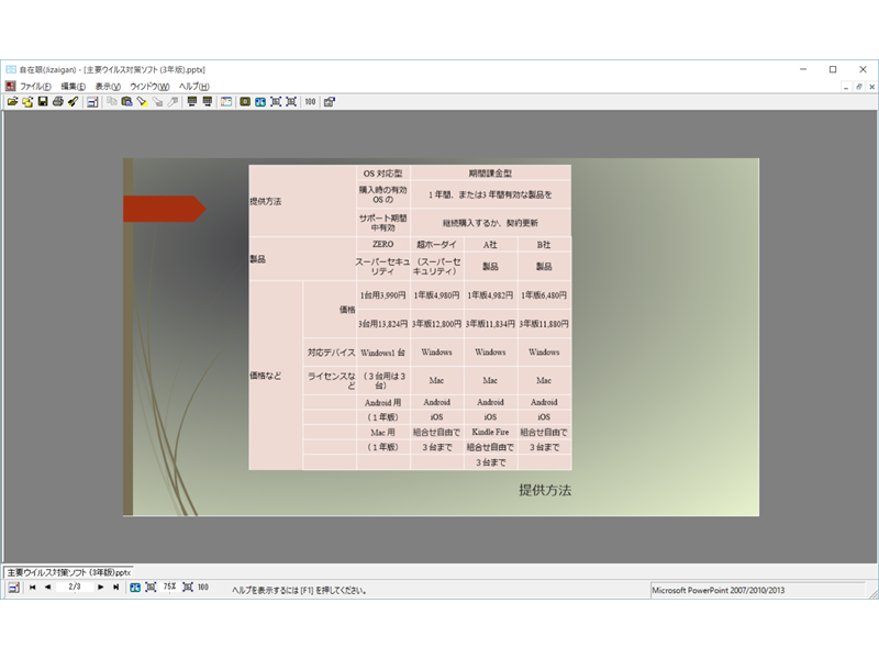 | パワーポイント | ・表示・印刷 ・画像保存機能 ・範囲選択とクリップボードへのコピー ・文字列検索機能(※新ビューアのみ) |