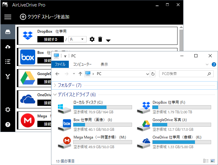 「Air Live Drive Pro」は、Dropbox、Google Drive、OneDriveなどのクラウドストレージを外付けハードディスクのように使用できるソフトです。