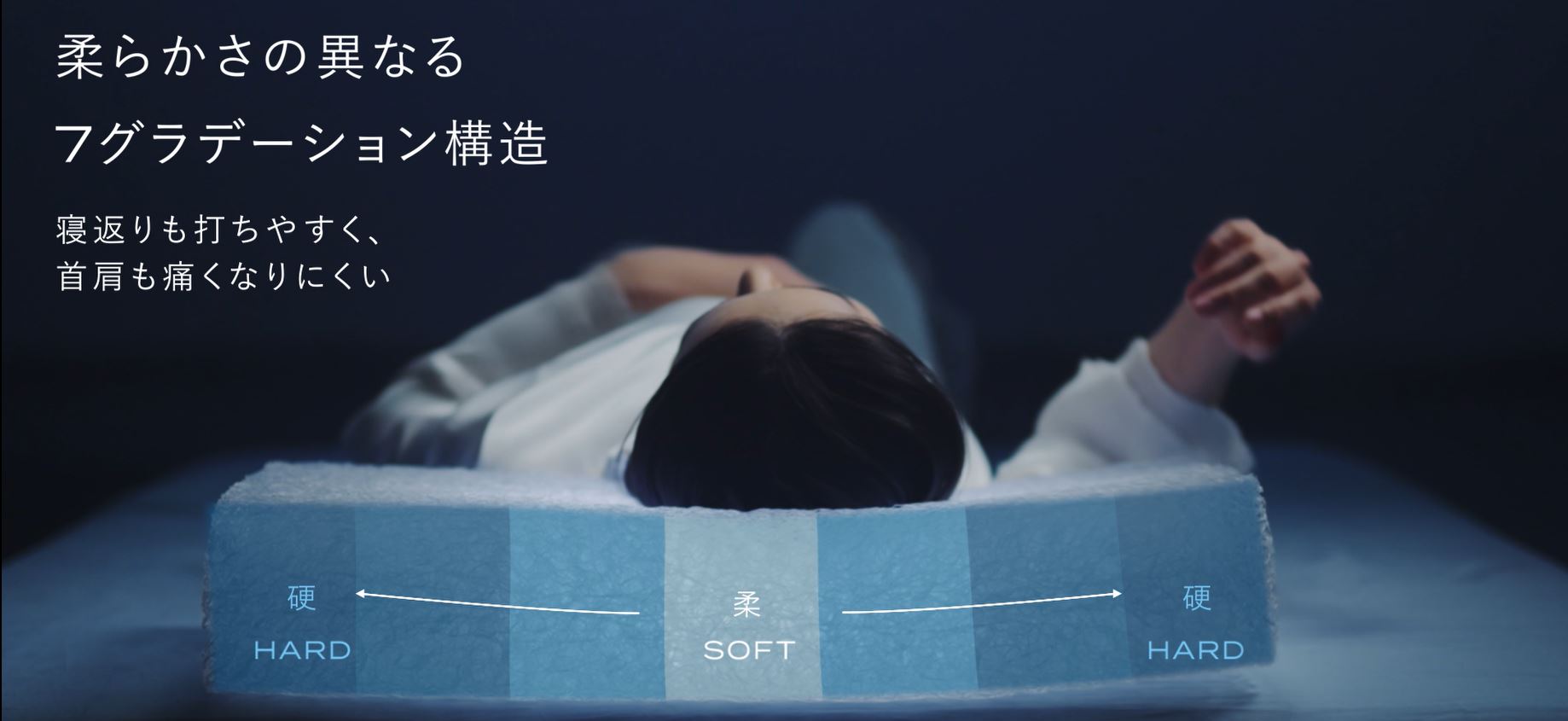 左右に行くほど弾力が高まる仕様にしているため、横寝の際に頭が沈み込みすぎず、寝姿勢が崩れません。横向き、うつ伏せなどどのような寝方にもフィットします。 また7グラデーション構造はスムーズな寝返りもサポートします。