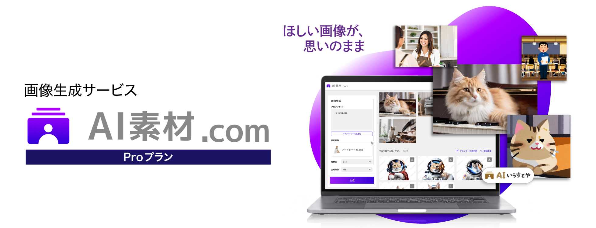 話題のAI画像生成を利用するには英語のサイトで環境を構築したり、グラフィックボードが必要な高額なパソコンを用意したりとハードルが高いことが多いですが、本サイトではすでに生成された画像から選んで利用したり、日本語のテキストを元に画像を生成でき、かんたんに使えます。