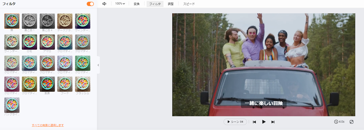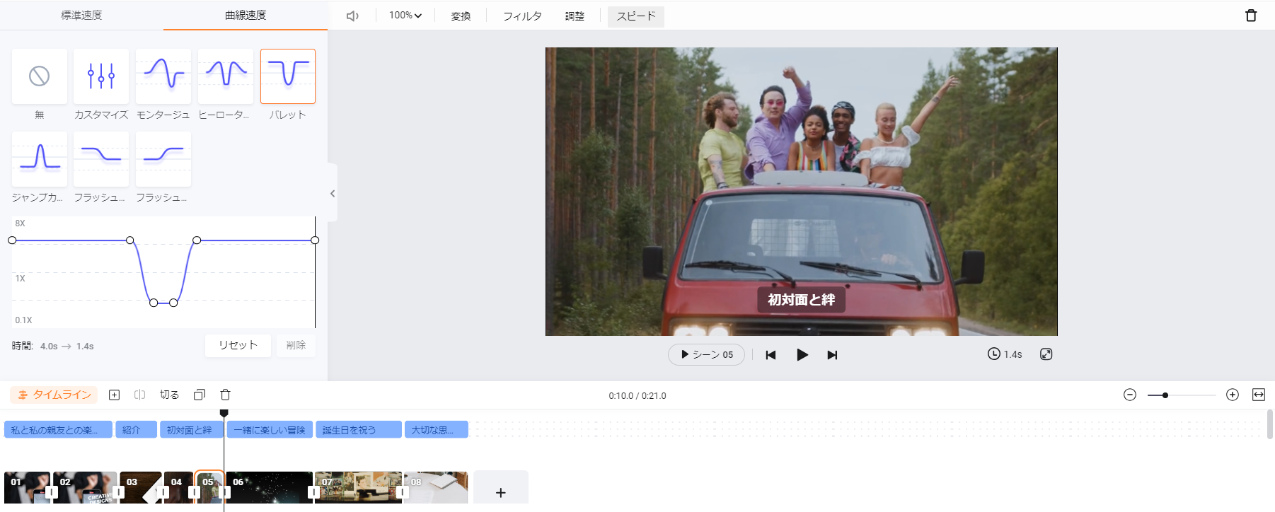 スローモーションとタイムラプス:でシーンの雰囲気に合わせて動画の速度を調整できます。