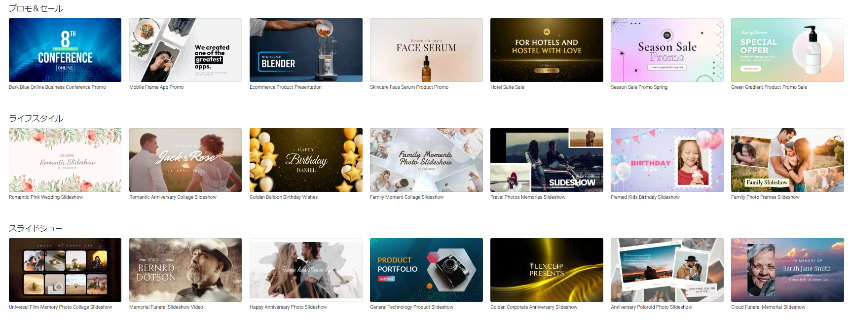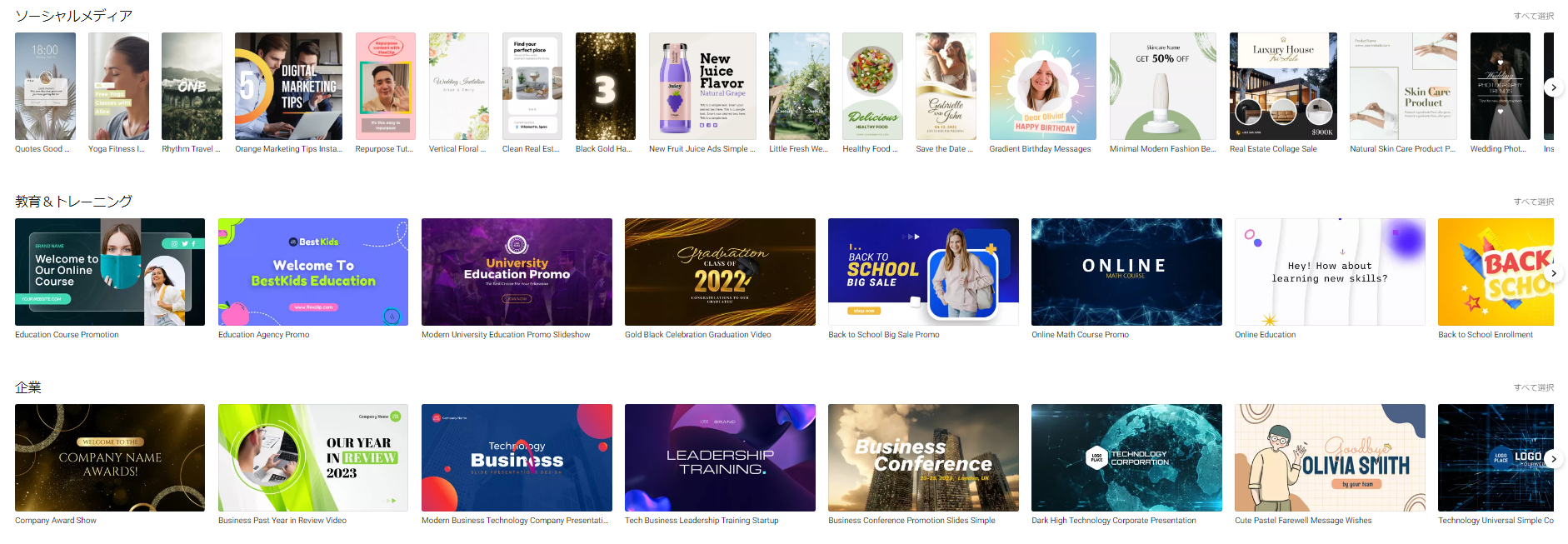 豊富なテンプレートから、瞬時に高品質な動画コンテンツを作成できます。ビジネスプレゼン、商品紹介、イベント告知など、さまざまなシーンや目的に合わせて、手軽にプロ並みの動画を作成できます。