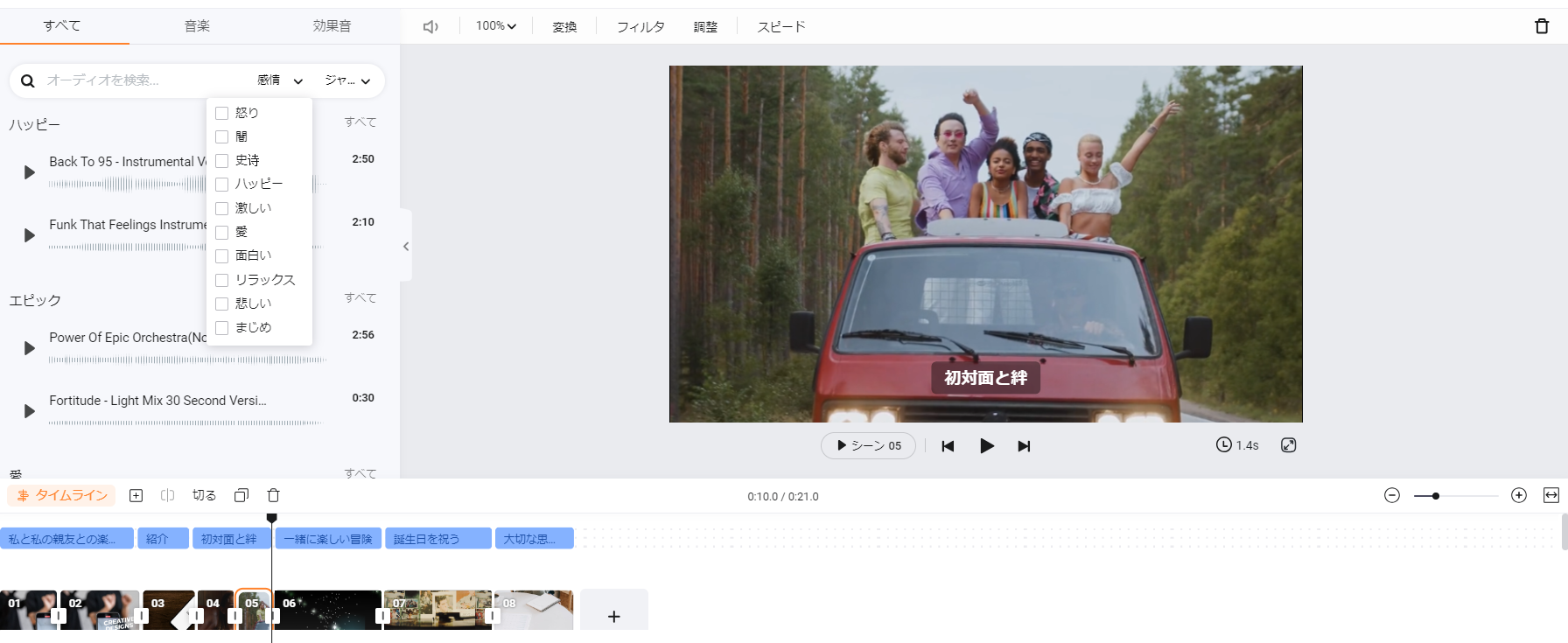 数百に及ぶBGMや効果音が用意されており、感情やジャンルから動画に合った雰囲気の音を選べます。