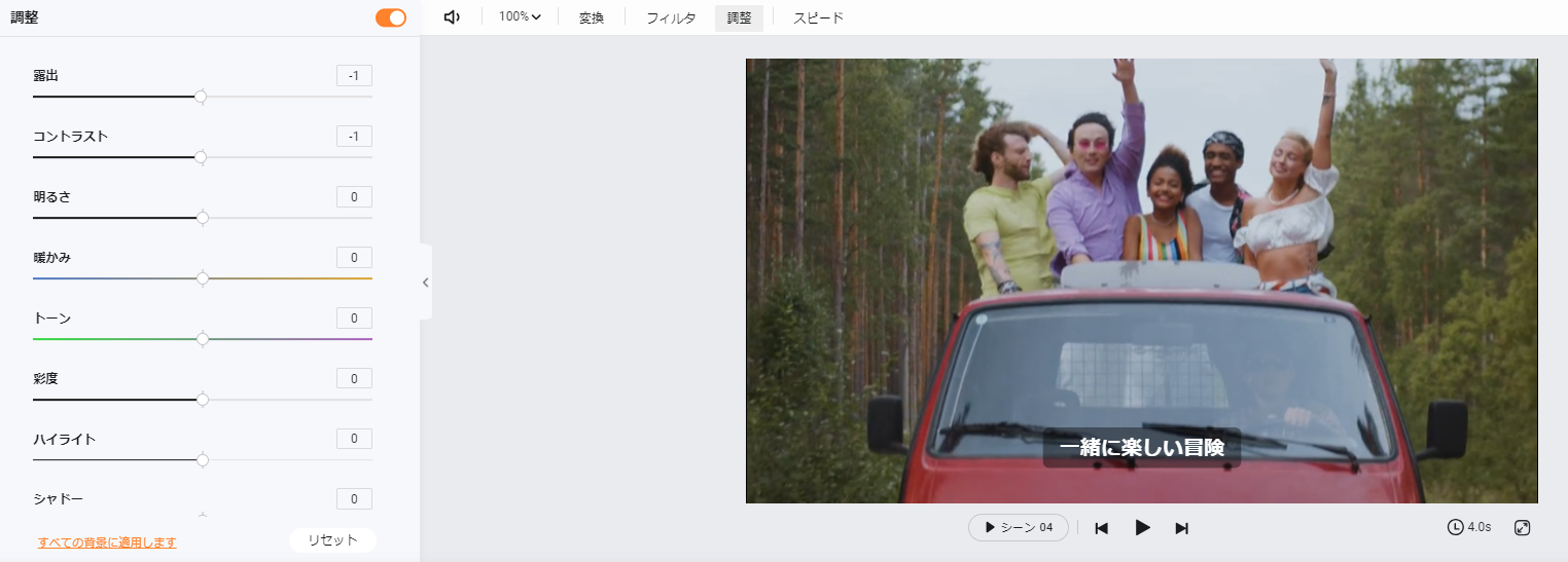 動画の全体的な印象を変えるために、明るさ、コントラスト、彩度などを微調整できます。