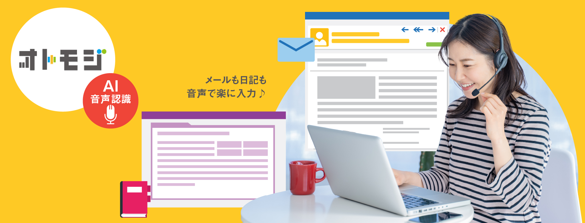 「オトモジ」はAI音声認識を活用して文字を入力できるソフトです。マイクに向かって話した声が文字に変換され、メールソフトやExcel・Word・PowerPointなど、どこにでも自分の「声」で文字入力ができます。
