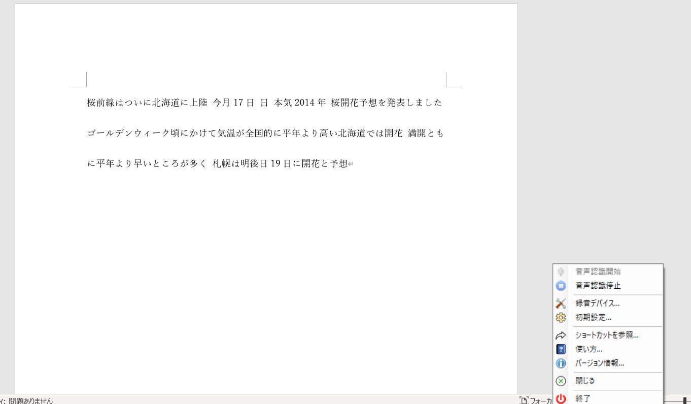 起動方法はとても簡単。タスクトレイの中にある「オトモジ」のアイコンをクリックし、「音声認識開始」を選択してください。すると、マイクに向かって話した声が、マウスカーソルを乗せた場所にどんどん文字として入力されます。