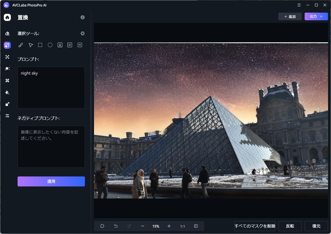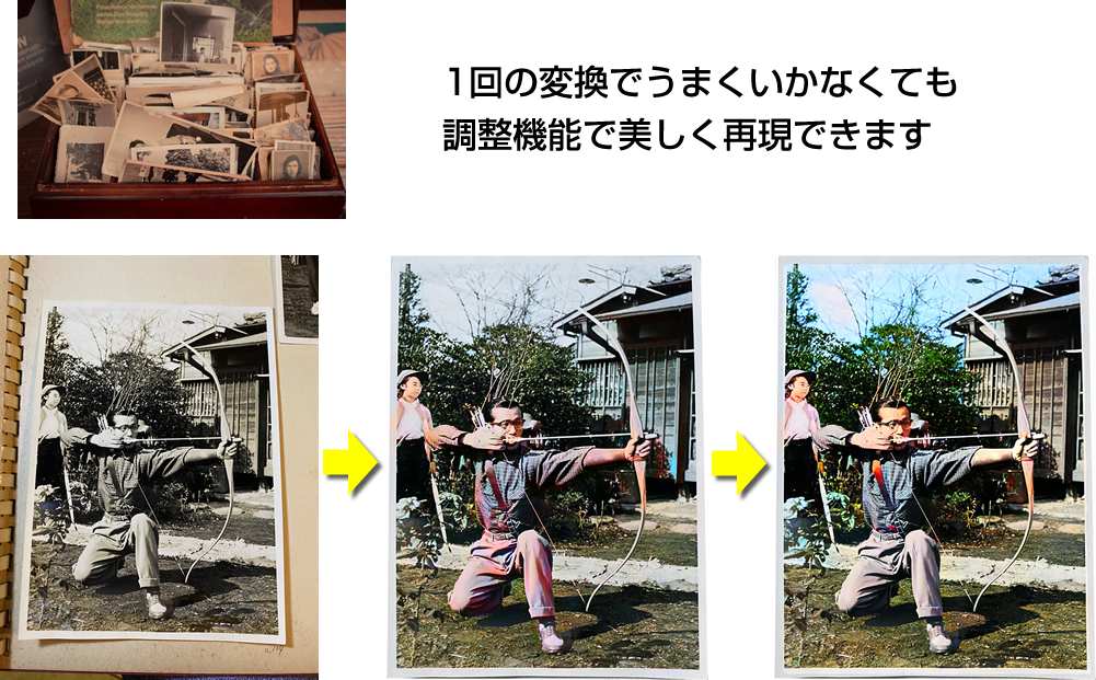 写真の切り抜きや、不要な箇所の除去を実現。さらに高精度なノイズ除去や鮮明化による美麗化や、色調を補正、モノクロ写真のカラー化までできます。