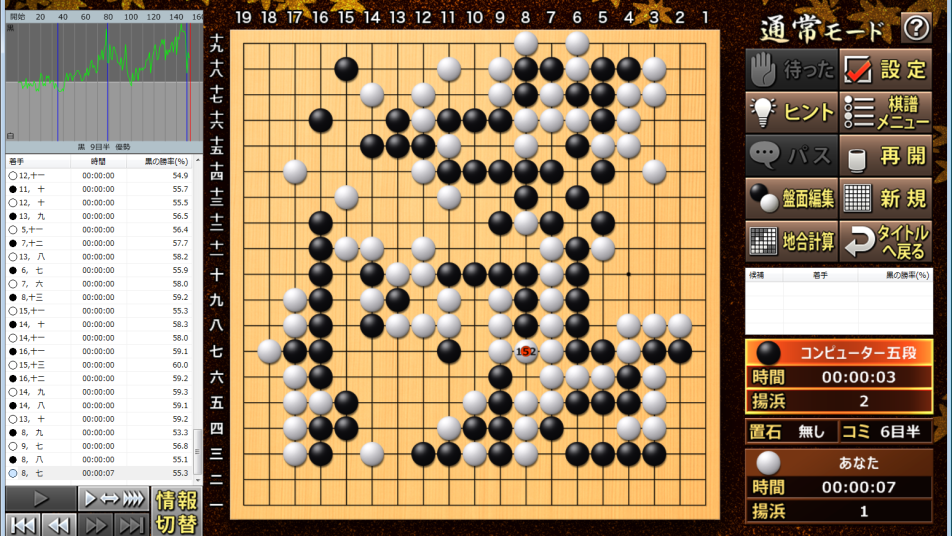 コンピューターが打った手に納得できない場合、その手を自分で打ち直して対局を続けることができます。