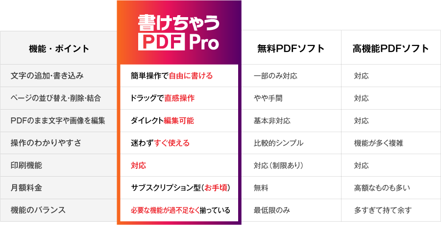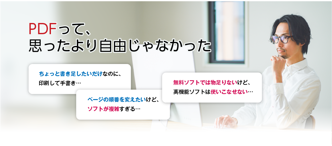 A. 無料のソフトは「書き込みしかできない」「並び替えはできるけど結合はできない」など、機能に制限があることが多いです。 「書けちゃうPDF Pro」は、書く・整える・送るまで、これひとつで完結します。