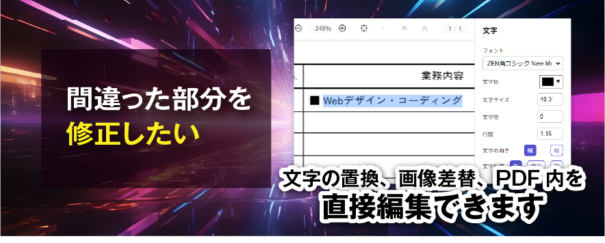 PDFに含まれる既存のテキストをそのまま修正可能。