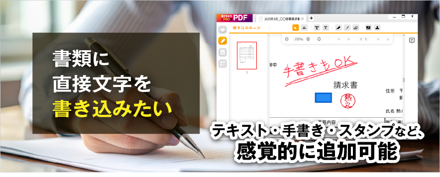 昔ながらの注文書や申請書も、PDFで来るようになって、書けちゃうPDF Proを使い始めたら、全部パソコンで済むようになりました。スタンプ機能も意外と便利で気に入ってます。(40代 男性)