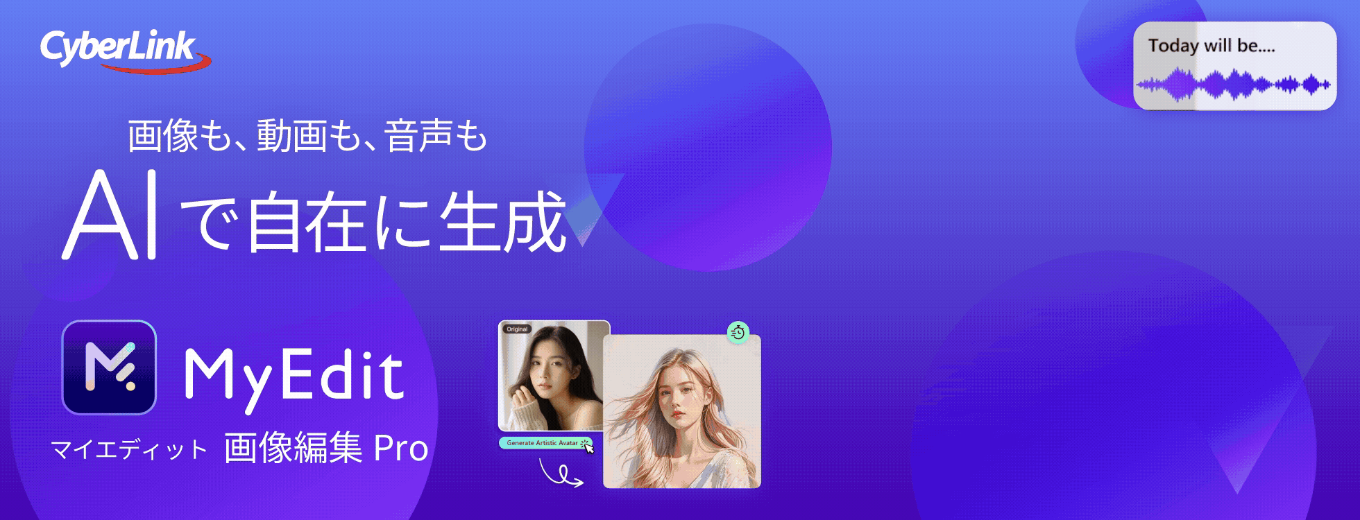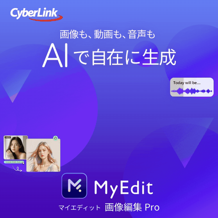 「MyEdit(マイエディット)」は、動画編集の分野で実績のあるサイバーリンク社の、AI画像・動画編集ツールです。