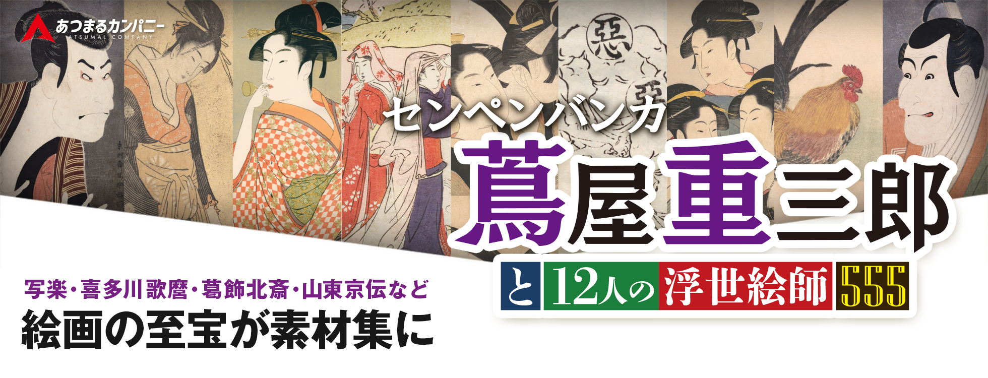 本作には、重三郎とゆかりの深い12人の絵師――写楽・歌麿・北斎・春章・清長など――の名作を中心に、計555点以上を収録。