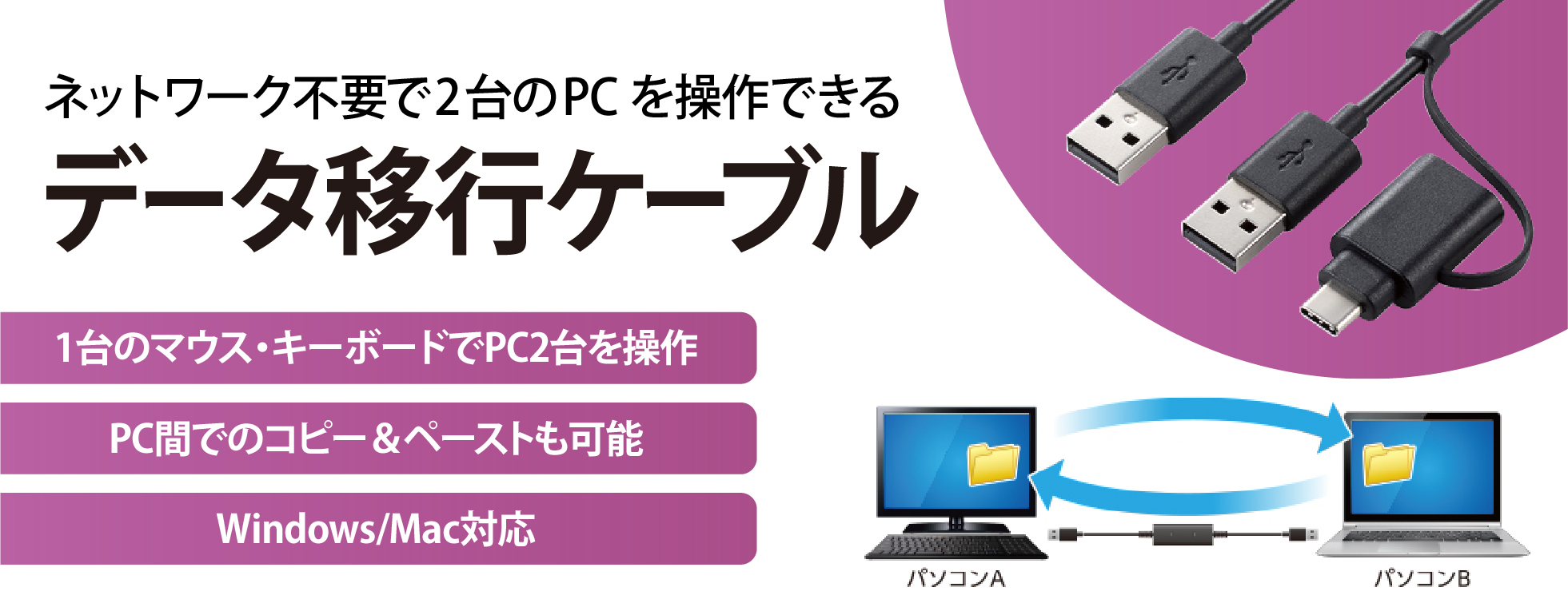 2台のPCを接続するだけで、簡単にデータを移行できるリンクケーブルです。1台のマウスやキーボードで2台のPCを操作したり、PC間でテキストのコピー&ペーストも可能。 ネット環境は不要なので、手軽にデータの整理が行なえます。