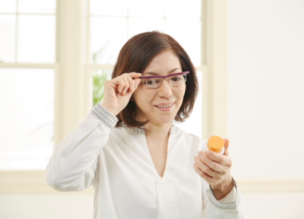 眼の調節力の低下による老眼。 年齢を重ねる度に調節力の低下が進み、老眼度数も変化・進行します。 本製品は、必要に応じツマミを前方又は後方に回すことで、遠視・老眼に対応できるメガネです。(乱視には対応していません)