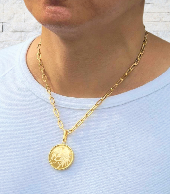 両面にクリスタル強化ガラスを使って純金のコインにキズガつかないように保護されています。 男性でも女性でも付けられるデザインです。