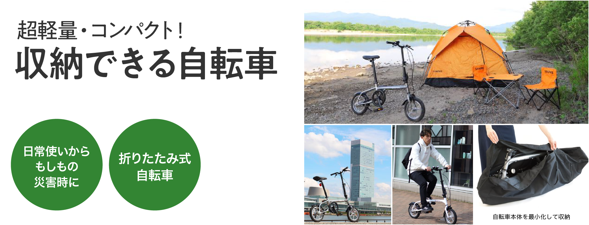 ハンドルやペダルを折り畳みコンパクトサイズに変形できるので、場所をとらずに収納でき、持ち運びにも便利な自転車です。住まいや事業所に1台備えておけば、日常使いだけでなく、災害時の足としても活躍します。