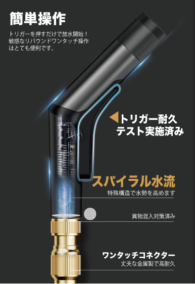 トリガー耐久テスト実施済み噴射はワンタッチ操作なのでとても便利です。トリガーを押して放水開始!もう一度押せば止水します。