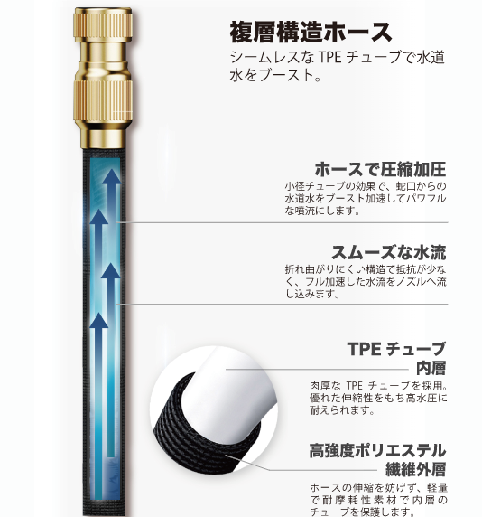 小径チューブの効果で、蛇口からの水道水をブースト加速してパワフルな噴流にします。