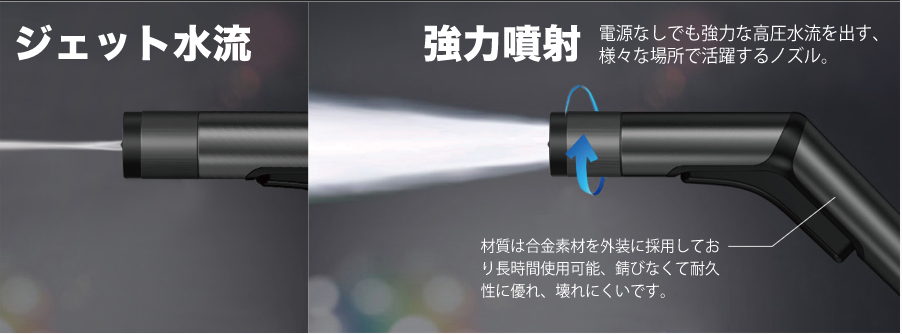 電源なしでも強力な高圧水流を出す、さまざまな場所で活躍するノズル。