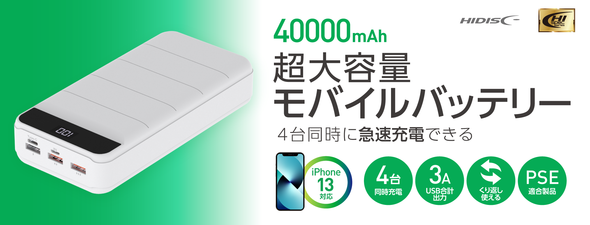| 商品名 | HIDISC PD20W対応超大容量40000mAhモバイルバッテリー |