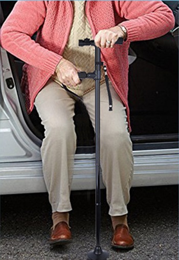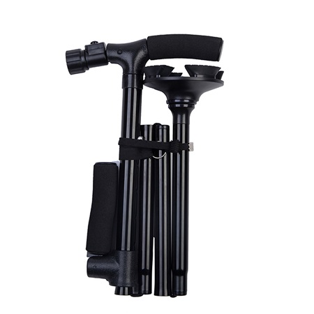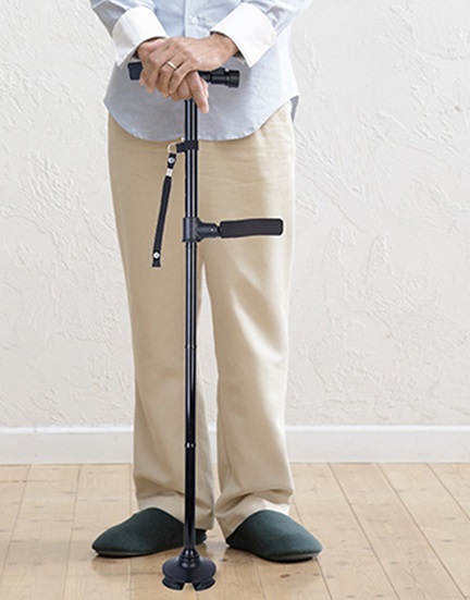 手を離しても倒れない自立式のステッキです。4点の接地で地面をしっかり掴み、軸は柔軟に360度曲がり安定感があります。補助ハンドルも折り畳むことができます。