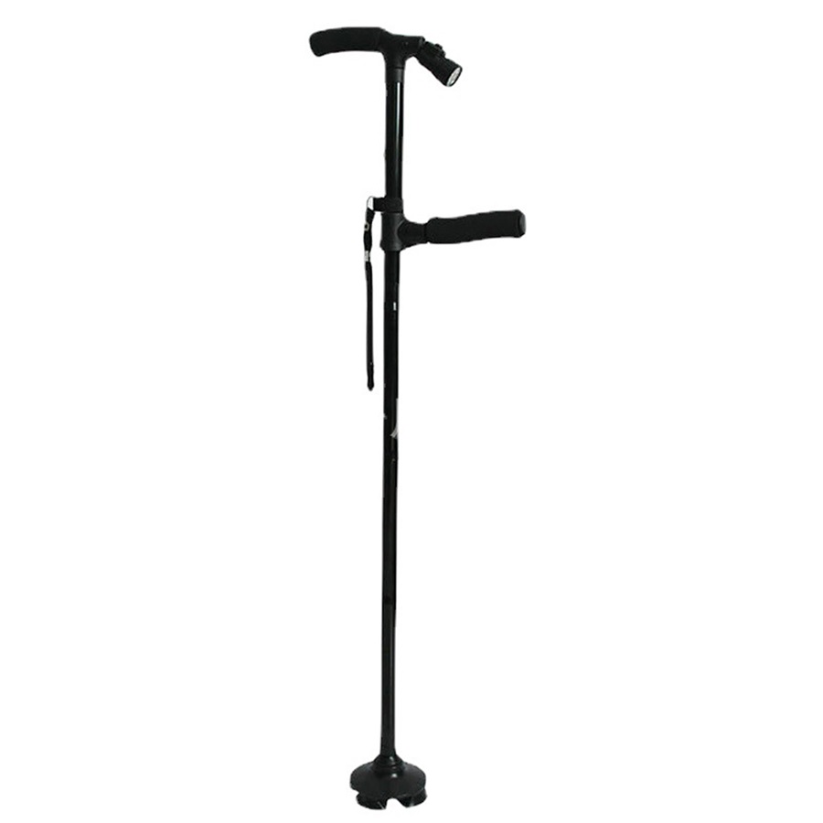 ステッキの先端にはLEDライトがついており、上部のボタンを押すだけですぐに点灯するので、暗い場所でも安心して使用できます。ライトは角度調節できるので、足元だけでなく遠く広くを照らすこともできます。