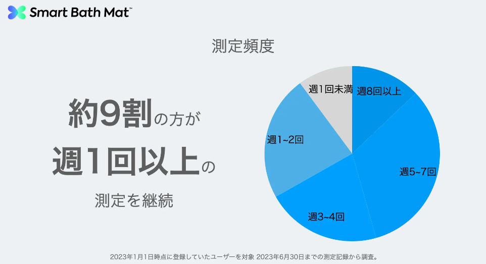 2023年上半期の、「スマートバスマット」ユーザーの15,000人の測定データを調査した結果、約9割の人が週一回以上の体重測定を継続していることがわかっています。ヘルスケア製品を製造・販売する某大手メーカーの利用者データによると、一般的には週1回以上の高頻度利用ユーザーは3-4割程度とされており、「スマートバスマット」の利用者は、その2-3倍も多くの割合の方が体重測定を継続できているという結果となります。お風呂上がりに、バスマットに乗るだけで体重が測定されるので、モチベーションが限りなく低くても続けられるのです。