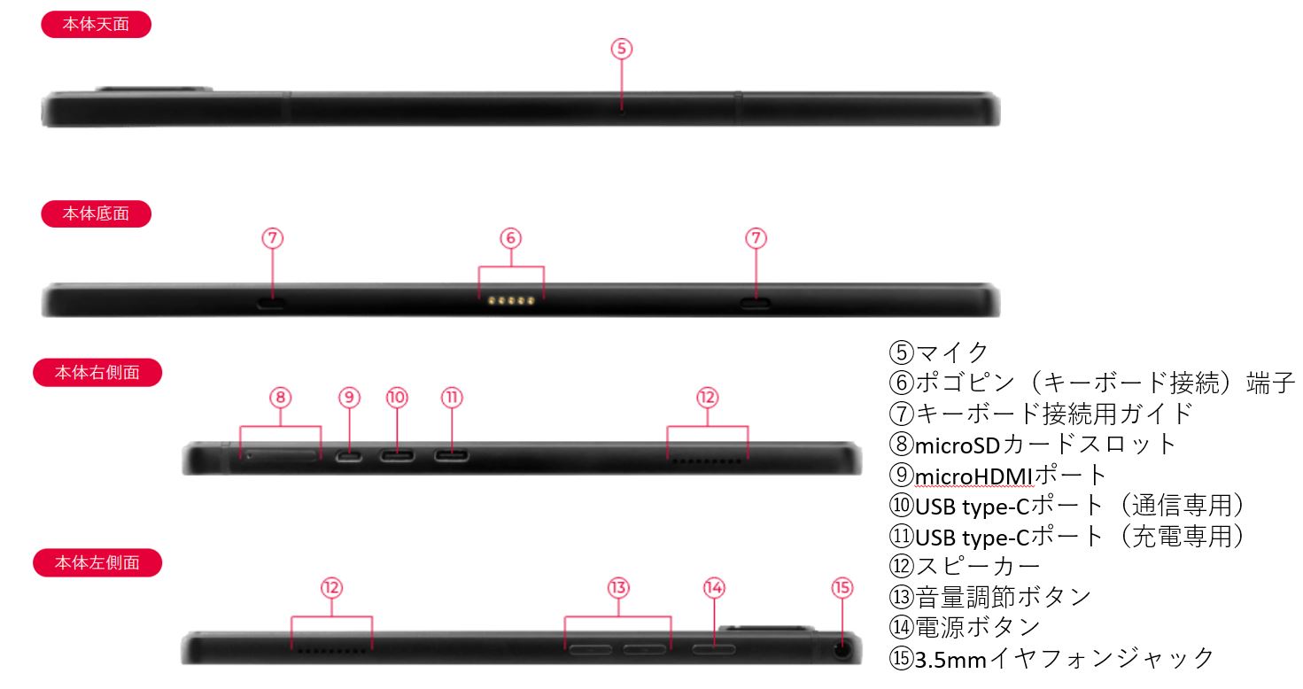 | インターフェイス | USB type-Cポート×2(1つは充電専用) ・ micro HDMIポート ・ キーボード接続端子 ・microSDカードスロット・3.5mmイヤフォンジャック |