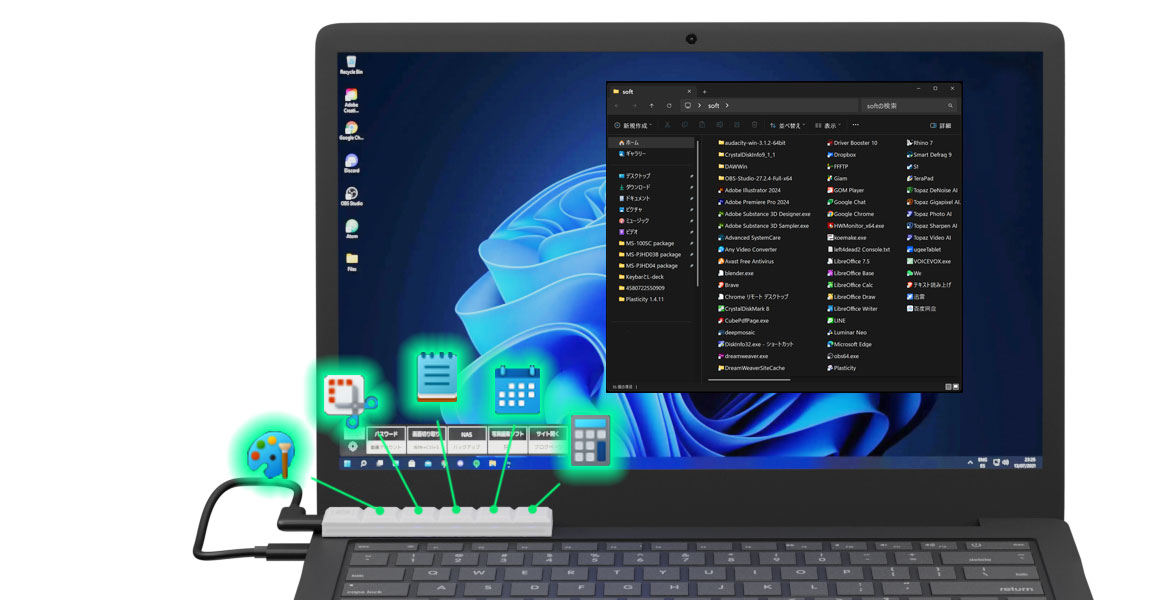 Microsoft社が提供しているオートメーションソフトPower Automate Desktopなどを始めとする高度のソフトウェアと組み合わせ使用することができます。エクセルの自動化、Windows操作の自動化、より複雑な一連の操作を作成してショートカットキーに登録し、本製品に登録することで、ワンタッチで複雑な操作をオートメーション化が可能です。