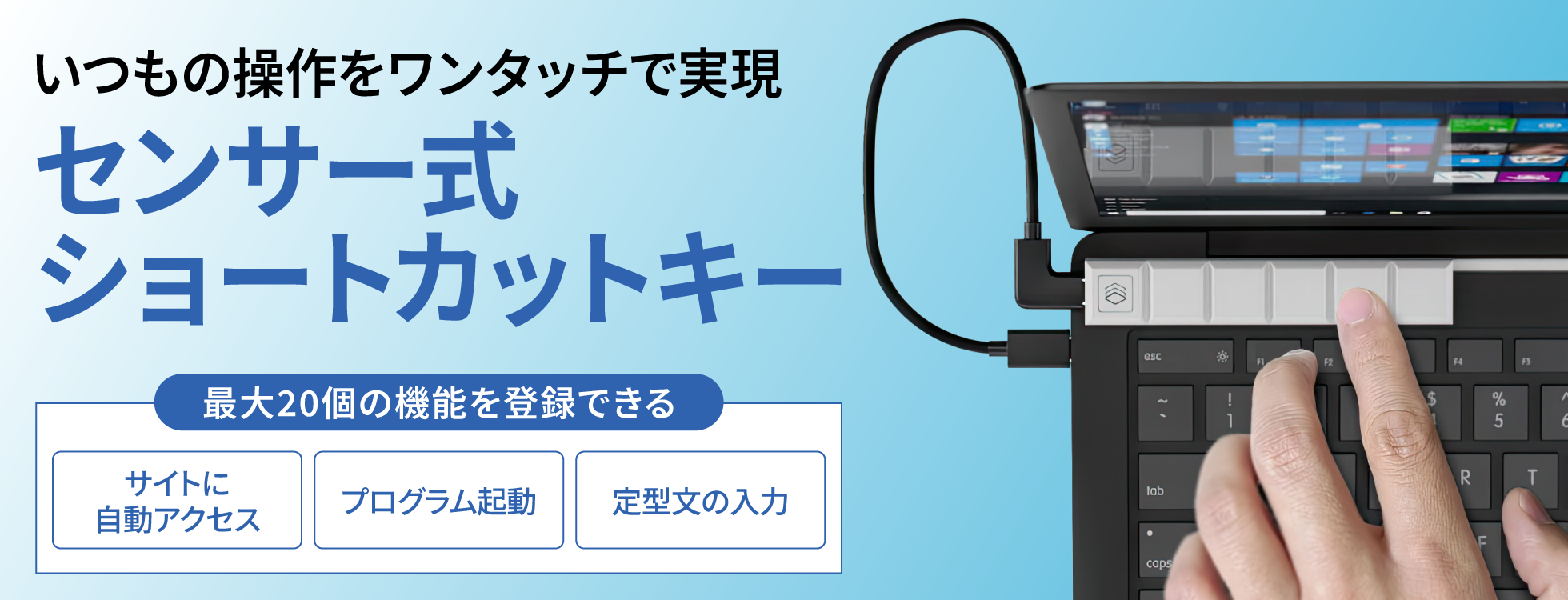 ストロークゼロディスタンスのセンサータッチ式を採用。従来のショートカットキーはストロークがあり、しっかり最後まで押さないと実行されないのに対し、本製品は指または手の一部をタッチさせるだけで設定したキーを実行することが可能です。これにより押しづらい場所にあっても押しやすく、またストロークがないため、マウスやペンを手に持った状態でも手の一部を触れさせることでキー実行が可能なので、より操作環境に柔軟に対応ができます。