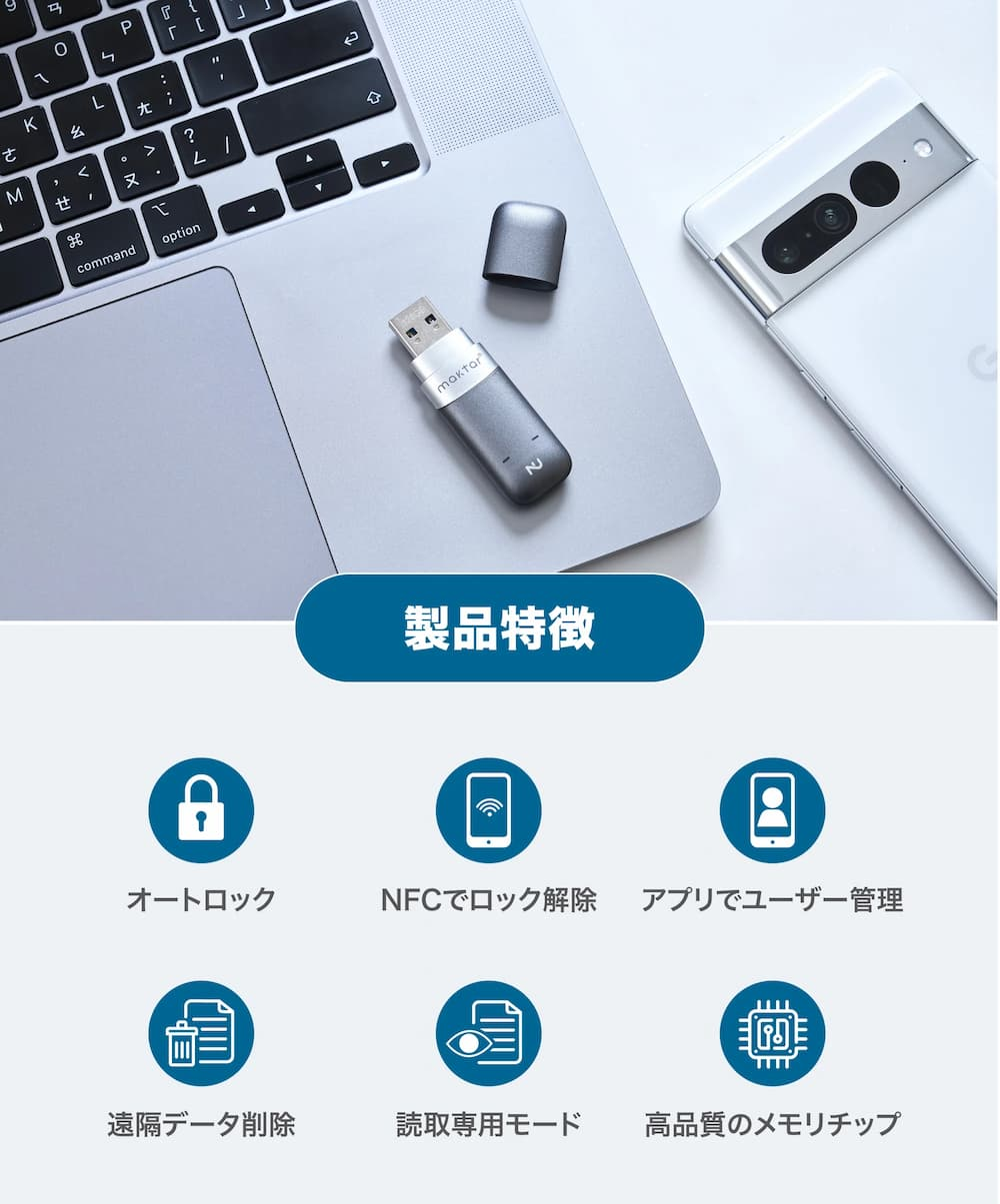 Nukiiアプリ対応機種 iPhone 8以降(iOS 14以降) ※iPad非対応 NFC機能搭載のAndroidスマートフォン 規格 USB-A カラー スペースグレー 保証期間 2年 重量 10g サイズ 63.3×19.6×10.2mm データ転送速度 読出し:120MB/S 書込み:70MB/S 容量 128GB 製造者 Maktar INC. 原産国 台湾 認証 CE, FCC, BSMI, UKCA